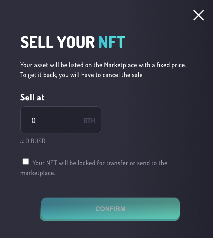 To sell your NFTs, go to the ‘My NFTs” tab and select the NFT you want to sell and click on “Sell your NFT”. Once clicked, it will open this pop up. Do note that if you listed your NFT on an external marketplace that is not on bithotel.io, then it could happen that your NFT does not show up under the My NFTs section as it is already listed elsewhere!