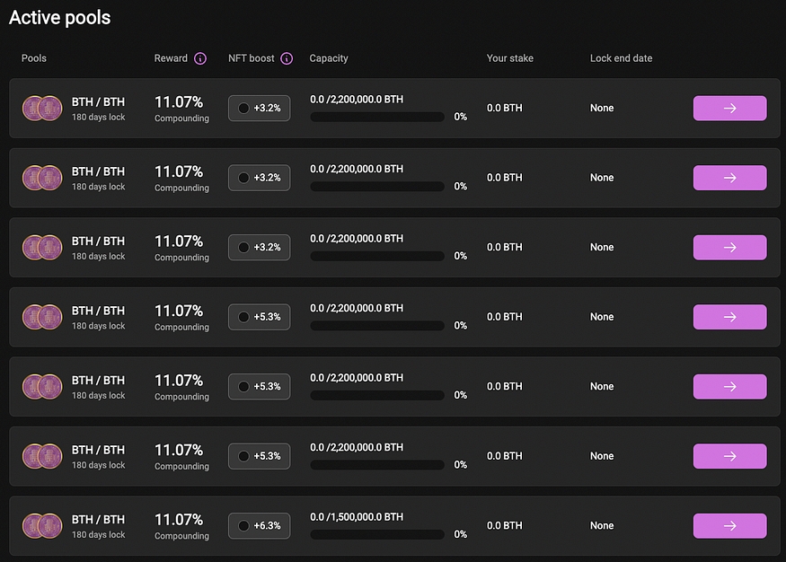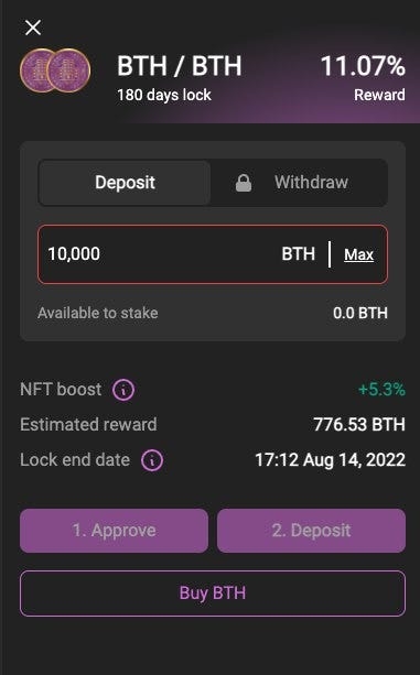 Once you have $BTH in your wallet, you can easily stake them by clicking on the pool, which will open this pop-up to confirm.